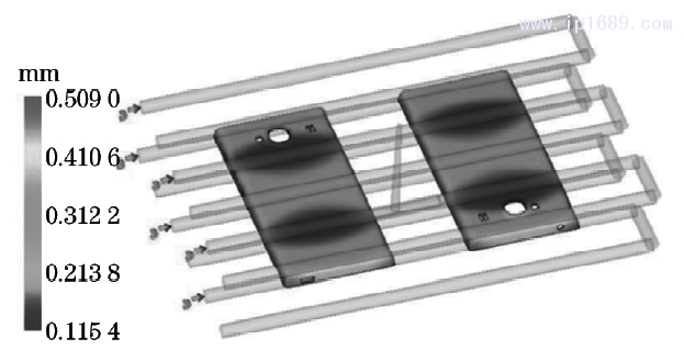 最佳工藝參數組合 A3B1C2D1未出現在正交表中,為驗證其可靠性,在 MoldFlow 軟件中再次運行該注塑模擬。由圖3可以看出,最佳工藝參數下翹曲變形主要出現在手機后蓋四角處,且耳機插孔旁的翹曲變形量最大,為0.5090 MM,小 于 表2中 的所有數據。同時,對制件結構進行分析后,發現此處也是塑料熔體流動最為復雜的區域,且位于注塑模具的拐角部位,散熱條件較差,極易發生翹曲變形。