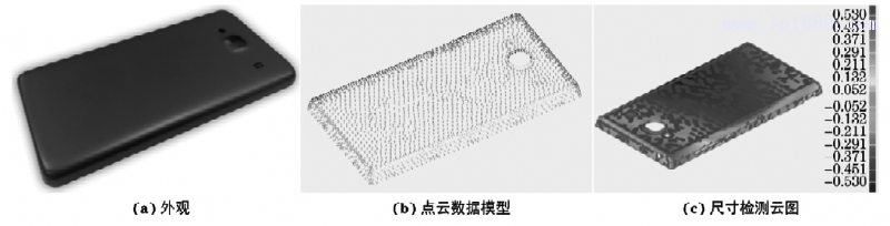 采用上述優化的工藝參數對薄壁制件進行生產試制,得到的手機后蓋的外觀如圖4(a)所示。采用daisyPH10T 型柔性三維激光掃描儀對試制產品進行點云掃描,獲 得 點 云 數 據 模 型,如 圖 4(B)所 示。將點云數據模型及原始三維模型導入 GEoMagiC軟件中,以點云數據為測試模型,原始三維模型為參考模型,在 GEoMagiCQualiFy中將測試模型與參考模型進行比較,得 到 如 圖4(C)所 示 的 尺 寸 檢 測 云 圖。由圖4(C)可以看出,翹曲變形主要出現在手機后蓋四角處,耳機插孔旁的翹曲變形量最大,為0.530MM,與有限元模擬結果基本吻合。