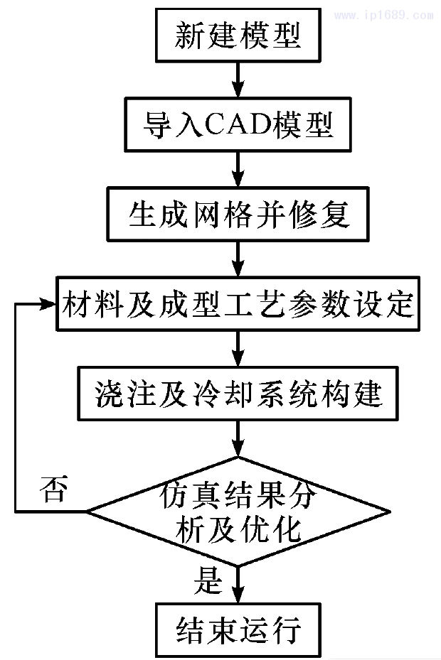 注塑成型 CAE 技術[2]是使用有限元、有限差分和邊界元等方法,動態仿真模具型腔內塑料熔體的填充、保壓、冷卻和翹曲變形等,預測潛在的充填不足、熔痕和翹曲等缺陷,進而優化產品、模具結構和成型工藝參數得到優質產品的一門應用科學技術。 Moldflow 軟件仿真流程,如圖 1 所示。其基本優勢如下: 1) “未 注 先 知”,針對所研究的 產 品,利 用Moldflow 軟件仿真出產品潛在的短射、熔接痕、翹曲、氣泡、水波紋和飛邊等問題。