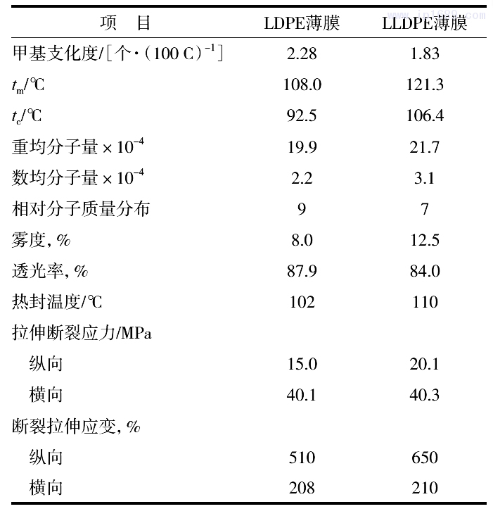 Tm和t c決定了薄膜的熱封性能和工藝。t c高有利于提高熱封強度,但tm過高,則熱封溫度會過高,造成熱封困難,且能耗大。從表1還可以看出:由于LDPE的tm較低,因此薄膜熱封溫度也較LLDPE低。聚乙烯的相對分子質量及其分布是表征聚合物結構的一個重要參數,對聚乙烯的聚集態和結晶相的形成有重要影響,進而對聚乙烯的加工和使用性能起著決定性的作用[3] 。更高的平均相對分子質量及更窄的相對分子質量分布,使薄膜具有更高的強度。因而LLDPE薄膜比LDPE薄膜擁有更高的拉伸斷裂應力,但是兩者的斷裂拉伸應變相差不大。