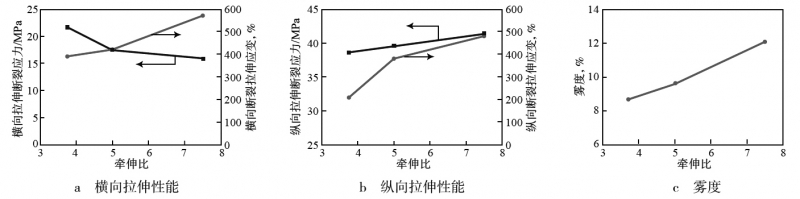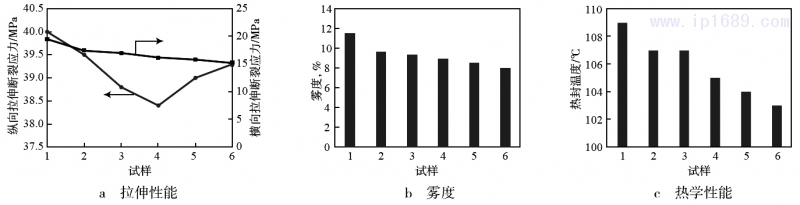 b)隨著共混物中LDPE含量的增加,流延薄膜的橫向拉伸斷裂應力逐漸降低,但是縱向拉伸斷裂應力則先降低后增加,光學性能提高,熱封溫度降低。