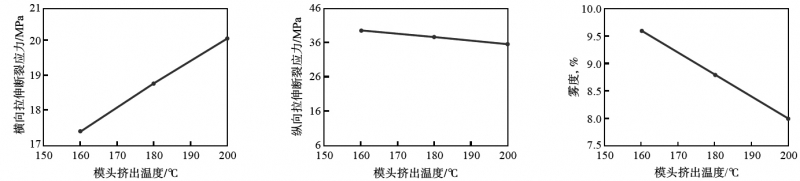 c)提高模頭擠出溫度可以使薄膜橫向拉伸斷裂應力增加,縱向拉伸斷裂應力降低,薄膜光學性能提高,熱封溫度降低;增加牽伸比,薄膜光學性能降低;提高流延輥溫度,流延薄膜橫向拉伸斷裂應力下降,縱向拉伸斷裂應力增加,光學性能下降,熱封溫度提高。