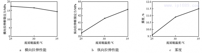 設定m(LDPE)∶m(LLDPE)為30∶70,擠出溫度為170~200 ℃,螺桿轉速為30 r/min,調節流延輥轉速使其對熔體的牽伸比為5.00,流延輥溫度分別為25,30,35 ℃,其中熱封溫度分別為107,108,110 ℃。 從圖4可以看出:隨著流延輥溫度升高,流延薄膜橫向拉伸斷裂應力下降,縱向拉伸斷裂應力增加,霧度增加,光學性能下降,熱封溫度提高。這是因為當流延輥溫度較低時,熔體從擠出機口模流出后黏附在流延輥表面被迅速冷卻,使熔體在拉伸應力場下的結晶受到了限制,因此結晶度和片晶厚度都較低。流延輥溫度升高時,相當于給予黏附在流延輥表面的流延薄膜一定的熱處理作用,使鏈段結晶更完善,結晶度和片晶厚度都得到提高,因此,提高流延輥溫度,流延薄膜縱向拉伸斷裂應力增加,光學性能下降,熱封溫度提高。