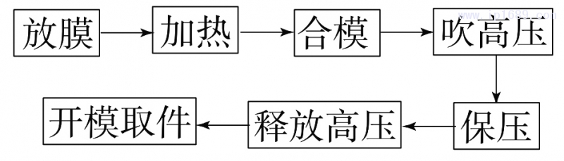 (4) 吹高壓。合模完成后,通過氣壓泵向模具內 吹高壓,高壓吹氣壓力為 30 MPa ;