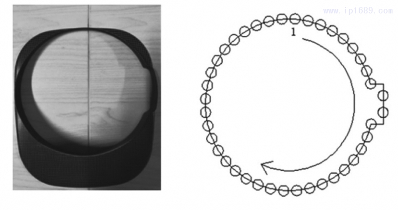 以 某 產 品 成 型 件 為 例 ,將 其 沿 周 向 切 開 ,選 取 40 個測量點,如圖 3 所示,分別測量這 40 個點所在位置的壁厚。成型件薄膜的原始厚度為 0.25 mm,選用千分尺作為測量工具。為了減小誤差,每個點 需要進行兩次測量然后取平均值,記錄并統計各個 溫度下壁厚的測量值。不同加熱溫度下高壓成型件 壁厚的分布如圖 4 所示,其減薄率數據列于表 1。