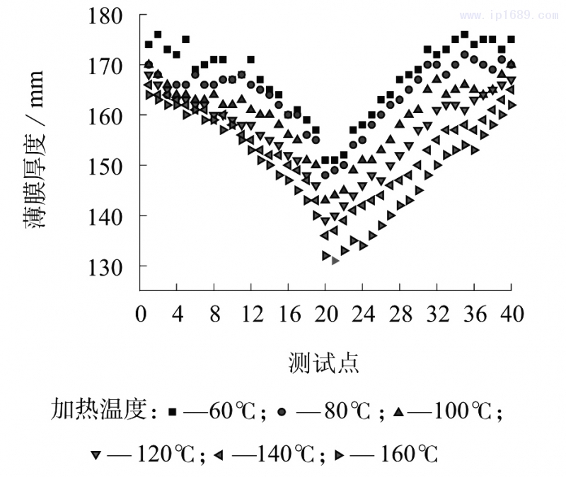 由圖 4 和表 1 可以看出,隨著加熱溫度的升 高,高壓成型件壁厚的減薄率越來越大,最小減薄 率發生在 60°C時,最小減薄率為 29.6% ;最大減薄 率發生在 160°C時,最大減薄率為 47.6%。在高壓 成型件的成型高度最高處,60°C下成型后的厚度為 0.151 mm,160°C下的厚度為 0.131 mm,由此可見, 溫度對高壓成型件壁厚的影響較大。