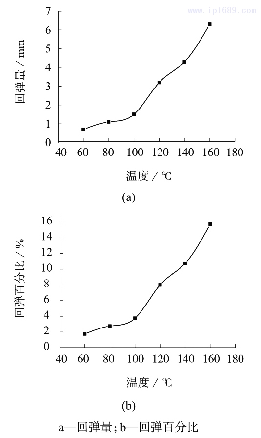 由圖 5a 可以看出,隨著加熱溫度的升高,高壓 成型件壁厚的回彈量增大。當加熱溫度低于 100°C 時,回彈量的增長較為緩慢,當加熱溫度超過 100°C 后,回彈量的增長會驟然加快。60°C時的回彈量為 0.7 mm,160°C時上升到 6.3 mm,表明加熱溫度對 高壓成型件壁厚的回彈量有顯著的影響。