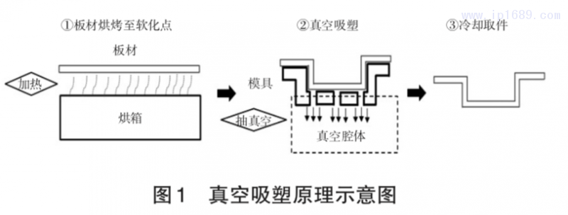 吸塑成型也稱真空吸塑成型,是將塑料片材 或板材加熱到粘彈性狀態,再通過真空吸引、與模 具表面貼合,冷卻后獲得所需要形狀的成型方法, 其工藝原理如圖 1 所示。