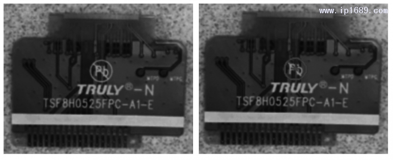 在實際生產中,也會遇到一些異形 FPC,拖著長長尾巴的 FPC 也是較常見的,如圖 7 所示,為了抓取牢靠,在 FPC 上料機上增加輔助吸嘴的機械結構來保證抓取穩固。該程序可以根據實際需要,返回機 械手最佳單一坐標,或者同時返回靶標圓心位置和輔助靶標圓心位置,如圖 8。