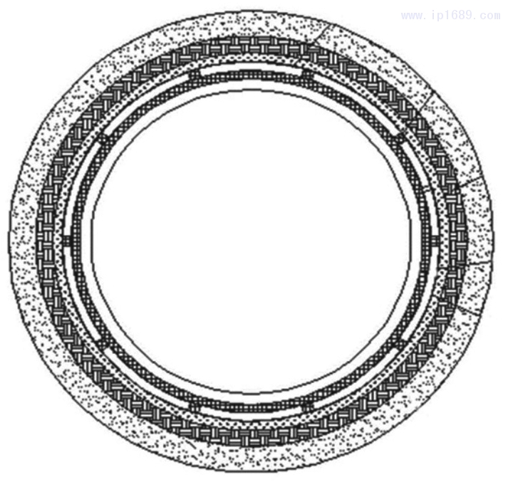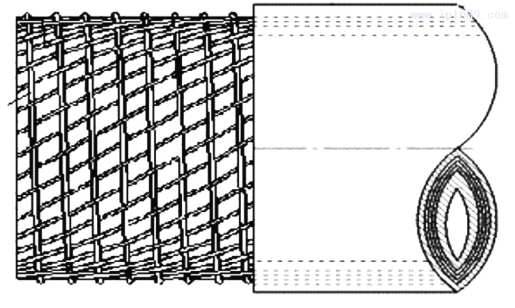 設置在內層管材與外層管材之間,緯線與經線的交叉點之間通過熱熔膠粘接或通過焊絲焊接。本實用新型采用經緯編織的方法在內層管材的外表面編織一個網