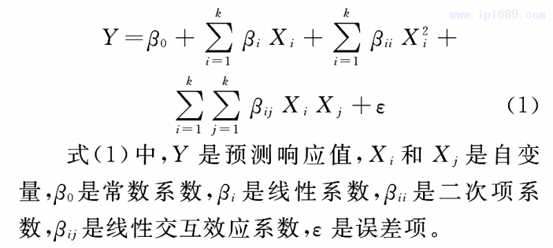 采用響應面回歸方法對BBD試驗數據進行分析,擬合式(1)所示為二階多項式響應模型[5]: