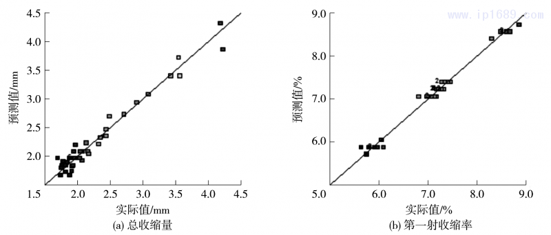 a)通過BBD試驗設計,進行了高光三色汽車尾燈罩燈的工藝參數優化,得到了響應模型,且響應的預測值與實際值較為接近,表明響應模型具有較高的精確度和可信度。