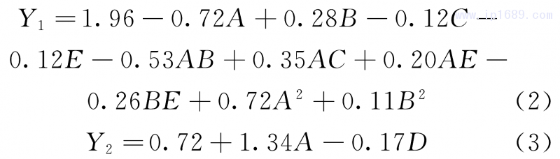 在表2的基礎上使用Design-Expert對試驗數據進行模型擬合,將失效率(p)大于0.05的非顯著因素排除,可得到如式(2)和(3)所示的方程式。