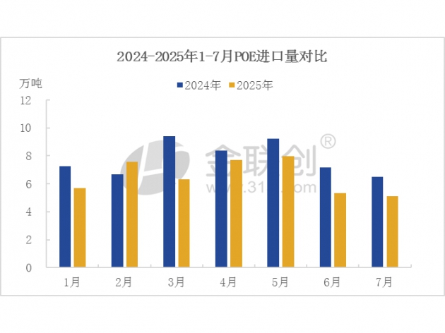 據海關數據統計,2025年7月,其他初級形狀的乙烯-a烯烴共聚物進口總數在5.1萬噸,同比減少21.7%,環比減少4.22%,2025年1-7月進口總量45.68萬噸,同比減少16.4%。