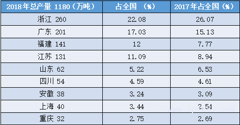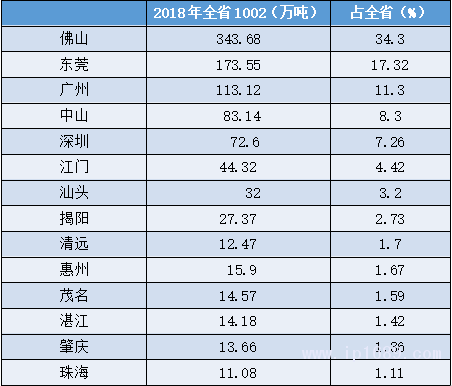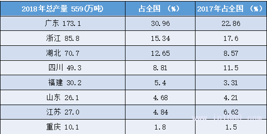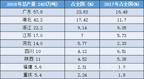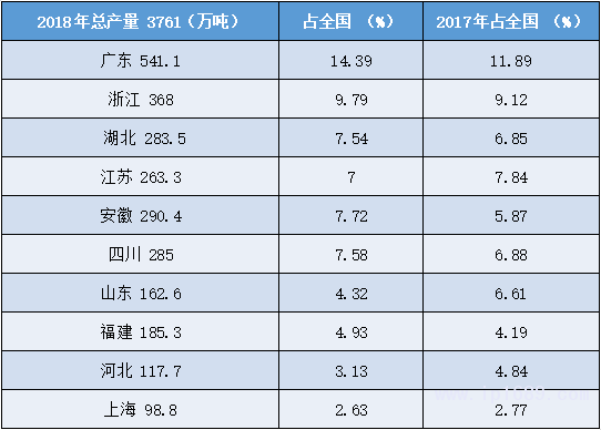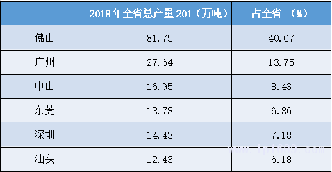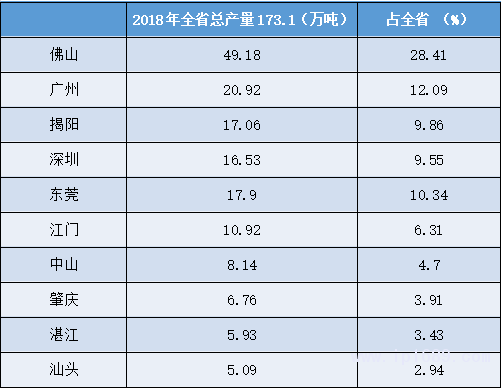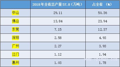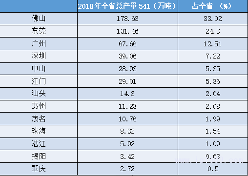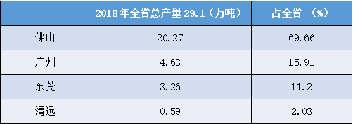 佛山、東莞、廣州等大灣區城市是主產區,佛山的產量占全國約4.75%,可排在省份第7。東莞的產量占全國3.5%,可排在同期省份第11 。