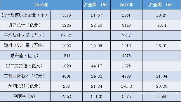 據統計,廣東是全國塑料加工業規模最大的省份,2018年統計規模以上企業共有3375個,資產總計3286億元,平均每家規模以上企業從業人員為69.21名,當年總產值4511億元,出口交貨值1020億元,主營業務收入4391億元,利潤總額202億元,利潤率4.62%。和2017年相比,廣東塑料加工業利潤總額、利潤率、出口交貨值平均從業人數等指標都有所下滑。廣東塑料加工產業和全國同業一道進入了調整、轉型階段。
