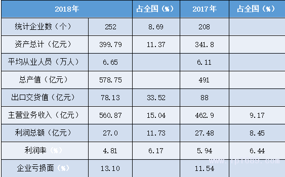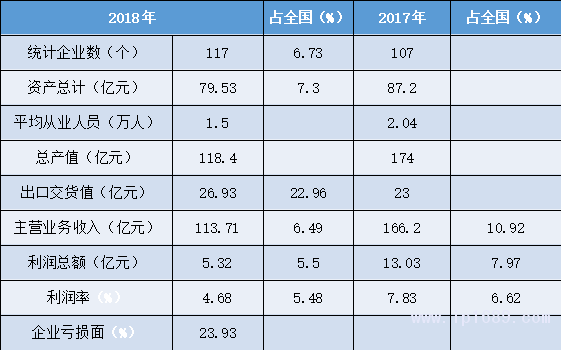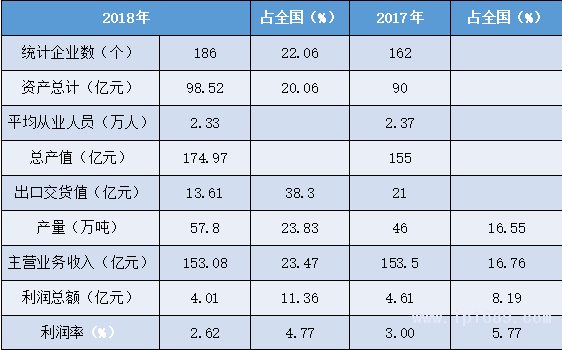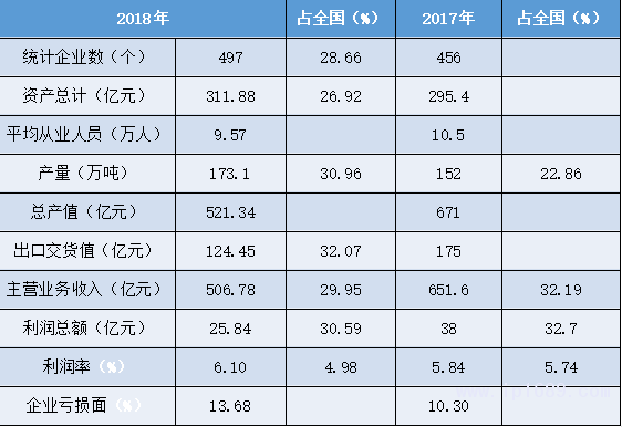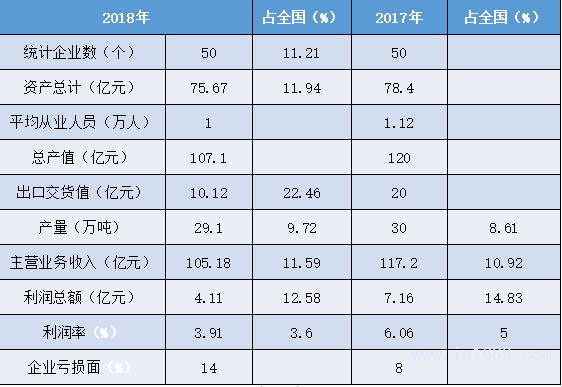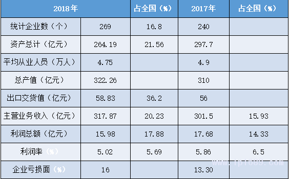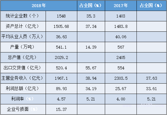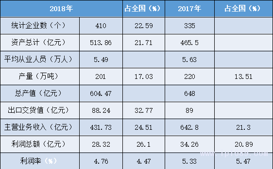 從業人員數量大,企業虧損面增大。產量占全國比重有所提升,產值、主營業務收入、利潤總額數據均有較大下降,利潤率略有提升,高于全國平均。
