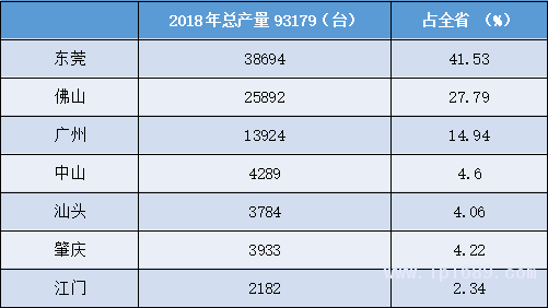 廣東是塑料機械生產大省,2018年產量占全國32.64%,主要產區在珠三角地區各市,以及粵東汕頭市。其中2018年東莞、佛山、廣州產量分別占全國13.55%、9.07%和4.88%,可排省份第3.4.5位。