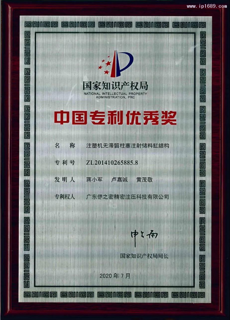 據統計,2020年伊之密申請專利83項,其中發明專利28項;獲得授權專利41項。其中“注塑機無滯留柱塞注射儲料缸結構”獲中國專利優秀獎。這是伊之密繼半固態鎂合金注射成型技術獲得第19屆中國專利優秀獎后,2020年在第21屆中國專利獎再獲該項專利榮譽。伊之密專利名錄再添一張“國家級名片”!
