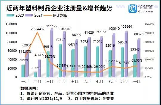 據數據統計,當前我國現存塑料制品相關企業有400.86萬家。2019年新增49.88萬家,同比增長33.78%;2020年新增72.92萬家,同比增長46.20%;2021年前10月新增88.49萬家,同比增長35.74%。最近的10月,我國新增塑料制品企業8.83萬家,同比增長65.05%。9月新增10.56萬家,同比增長51.73%。