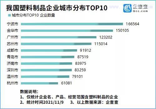 從區域分布來看,浙江以59.80萬家排名第一,廣東省、山東省分別有47.26萬家、46.64萬家,排在第二、三名。從城市分布來看,寧波位居榜首,有16.66萬家塑料制品企業,其次是金華、廣州等。