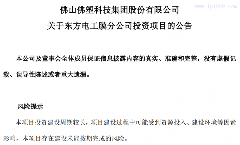 1月11日,佛山佛塑科技集團股份有限公司公告稱,公司下屬東方電工膜分公司擬在佛山市三水區投資19,570.19萬元建設超薄電容膜生產線及相關配套設施項目,進一步擴大電容膜產能,提升市場競爭力,鞏固和強化公司在電容膜的市場地位。