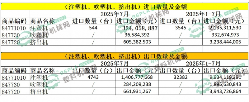 注塑機:2025年7月出口數量4743臺,出口金額1,406,777,668元;1-7月累計出口數量32382臺,出口金額9,934,119,291元。