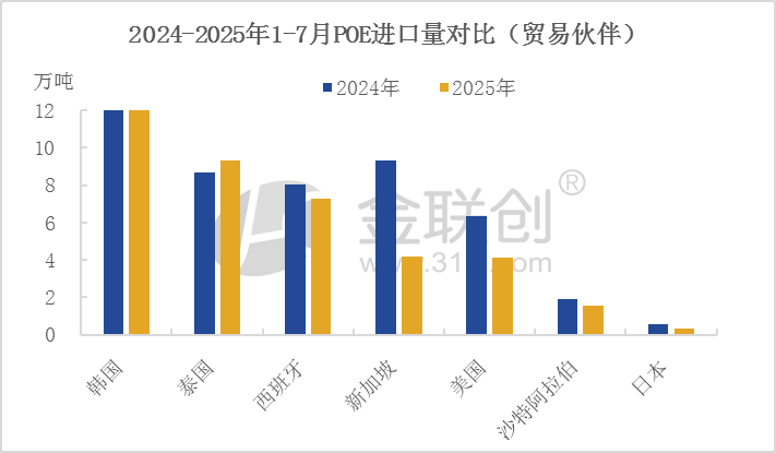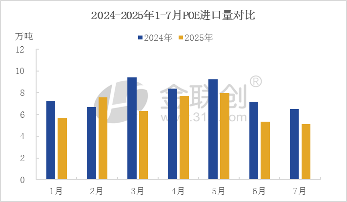 據海關數據統計,2025年7月,其他初級形狀的乙烯-a烯烴共聚物進口總數在5.1萬噸,同比減少21.7%,環比減少4.22%,2025年1-7月進口總量45.68萬噸,同比減少16.4%。POE彈性體進口量又降了。為何連連下降?