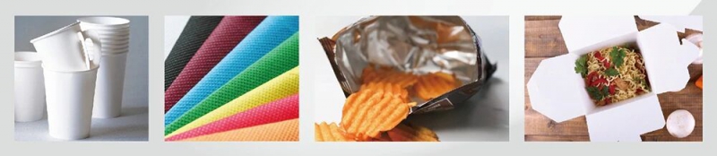 最常見的應用領域就是用于食品類的軟包裝材料,比如:盒裝的牛奶果汁容器、零食餅干包裝、紙杯以及餐盒內部,這些主要都是用于防油水滲透或是阻絕空氣等作用。