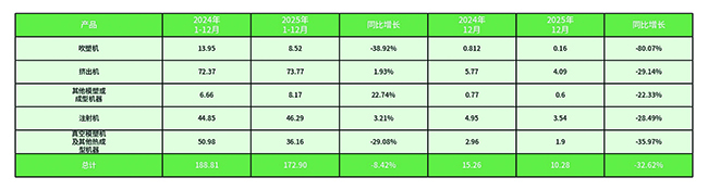 2025年注射機、擠出機、其他模塑或成型機器出口同比增長,其他模塑或成型機器出口同比增長超20%;從12月份的數據看,五大類機械進口均同比下降。