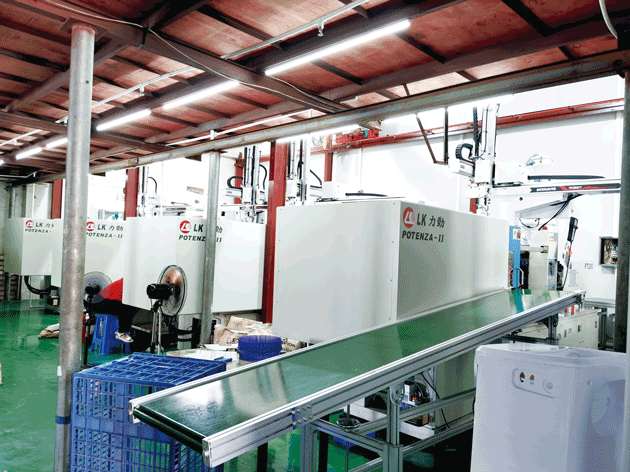 目前,華奇霖車間有15臺力勁、佳明、海天注塑機,并配有9臺艾爾發機械手。設備性能優越,很少有故障,主要生產燈罩、家電小配件,具備開模、設計、一體成型的一站式服務水平。