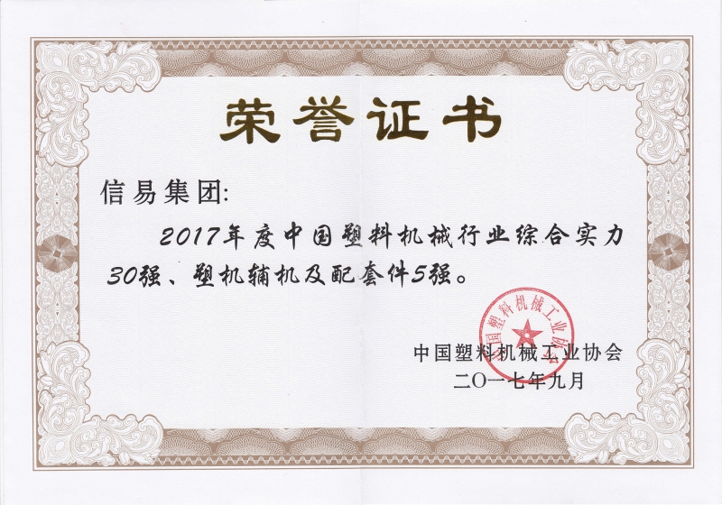 縱觀信易發展歷程,集團所獲榮譽眾多。2016年,信易集團榮獲中國塑料機械行業綜合實力榜25強、塑機輔機及配套件5強;2017年,獲中國塑機輔機5強之首;同年,集團注冊的“SHINI”獲國家馳名商標稱號;2018年,信易被認定為東莞市專利優勢企業。集團堅持大膽創新,以專業的技術能力和高品質的綜合服務贏得了客戶的好口碑,穩居行業前列。